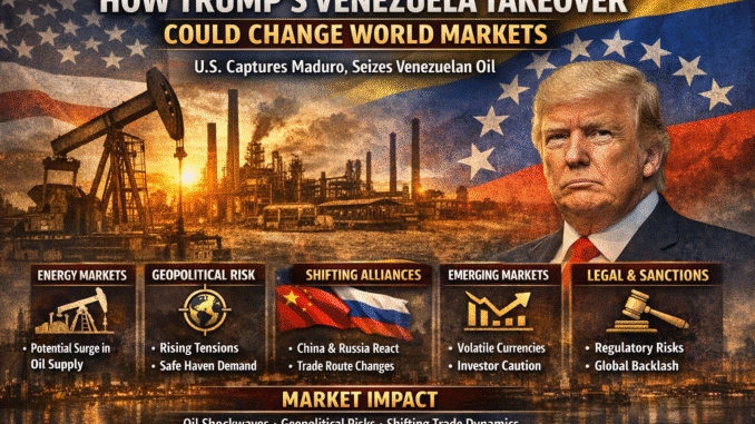 The unprecedented U.S. military intervention in Venezuela — culminating in the capture of President Nicolás Maduro and an explicit plan by the Trump administration to oversee Venezuelan oil production — has sent shockwaves across markets, geopolitics, and investor risk assessments. While the full picture is still unfolding, several key implications for global markets are now emerging.